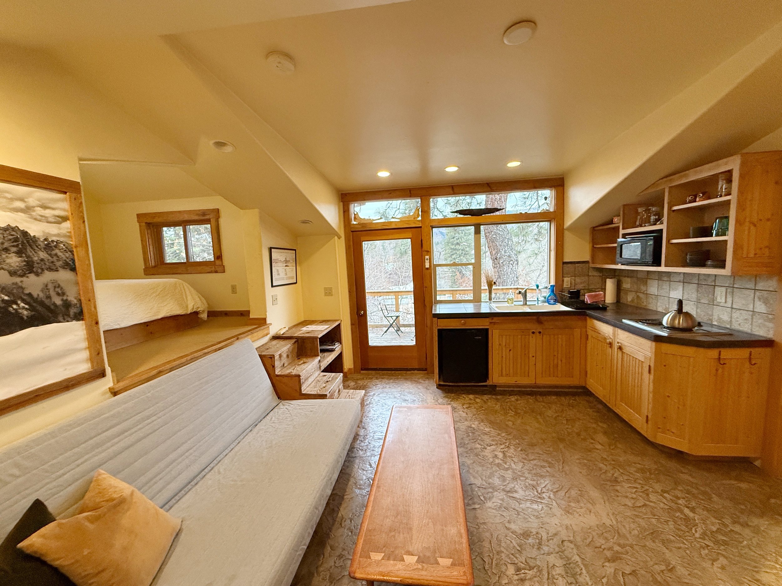 Private cabin with a kitchenette, full bathroom, and a large deck overlooking downtown Winthrop. Ideal for couples or solo travelers seeking independence and comfort.
